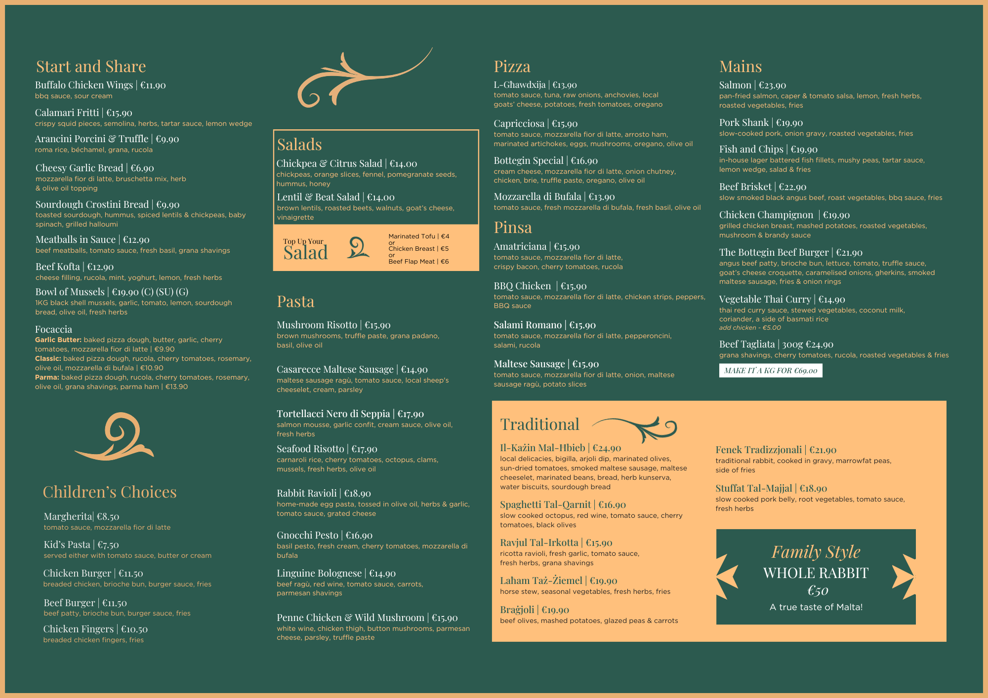 We are proud to present our menu at Bottegin Palazzo Xara offering a vast selection of delicious Mediterranean & Traditional food, with a variety of starters, pizzas, pasta, burgers, salads and grills.Our local delicacies, platters to share and mains are ideal for those of you looking to experience a variety of different flavours, bringing you your favourite dishes for the whole table while leaving you spoilt for choice! Be sure to leave space for our mouth watering desserts.